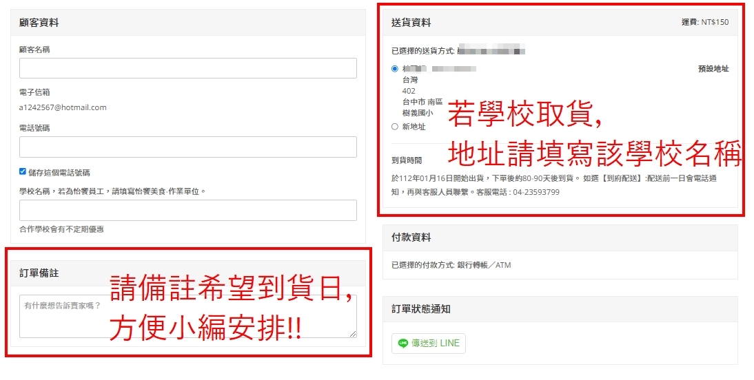 - 學校配送 : 地址請填寫貴校學校名稱。